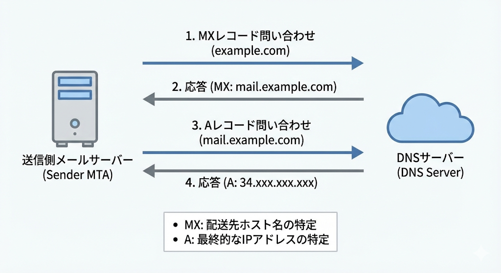 この2つの設定を組み合わせることでメールが届きます。 具体的には、MXレコードによって「@example.com 宛のメールは mail.example.com へ配送せよ」と指示され、その後Aレコードによって「mail.example.com のIPアドレスは 34.xxx.xxx.xxx である」と名前解決が行われます。