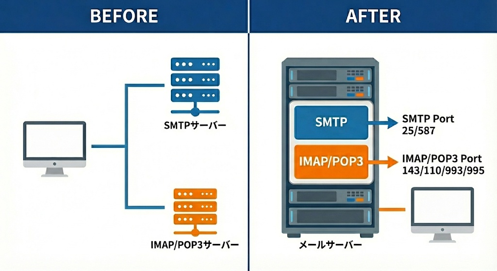 - After: SMTPやIMAP/POP3は単なる通信の規約(プロトコル)に過ぎない。一つのサーバーの中に、それぞれの役割を持ったソフトウェアが同居し、ポートを使い分けて待ち受けている。