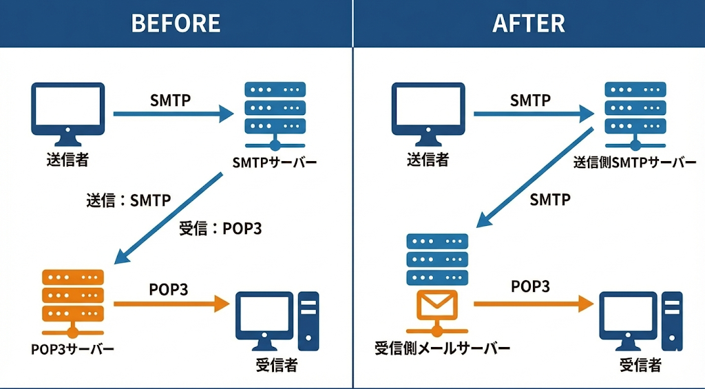 - After: SMTPは手元のデバイスからサーバーへの送信だけでなく、メールサーバー間の送受信の役割も担っている。一方POP3は、サーバーのメールボックスに届いたメールを、手元のクライアントへ引き出す役割を持っている。