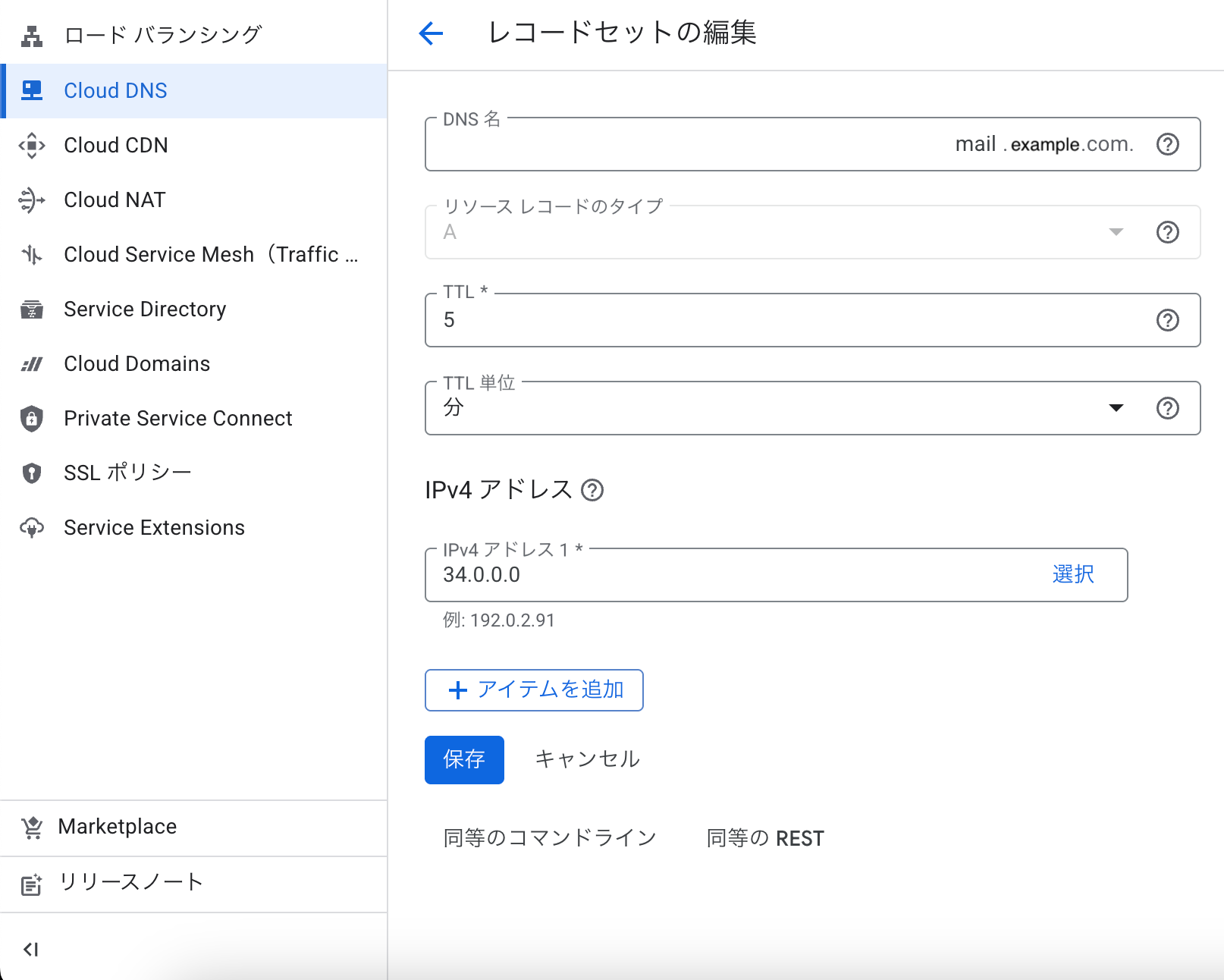 まずは、サーバーに名前をつけます。 メールサーバーとして稼働させるホスト名(例: mail.example.com)に対し、VMインスタンスの外部IPアドレス(例: 34.xxx.xxx.xxx)を紐付けます。