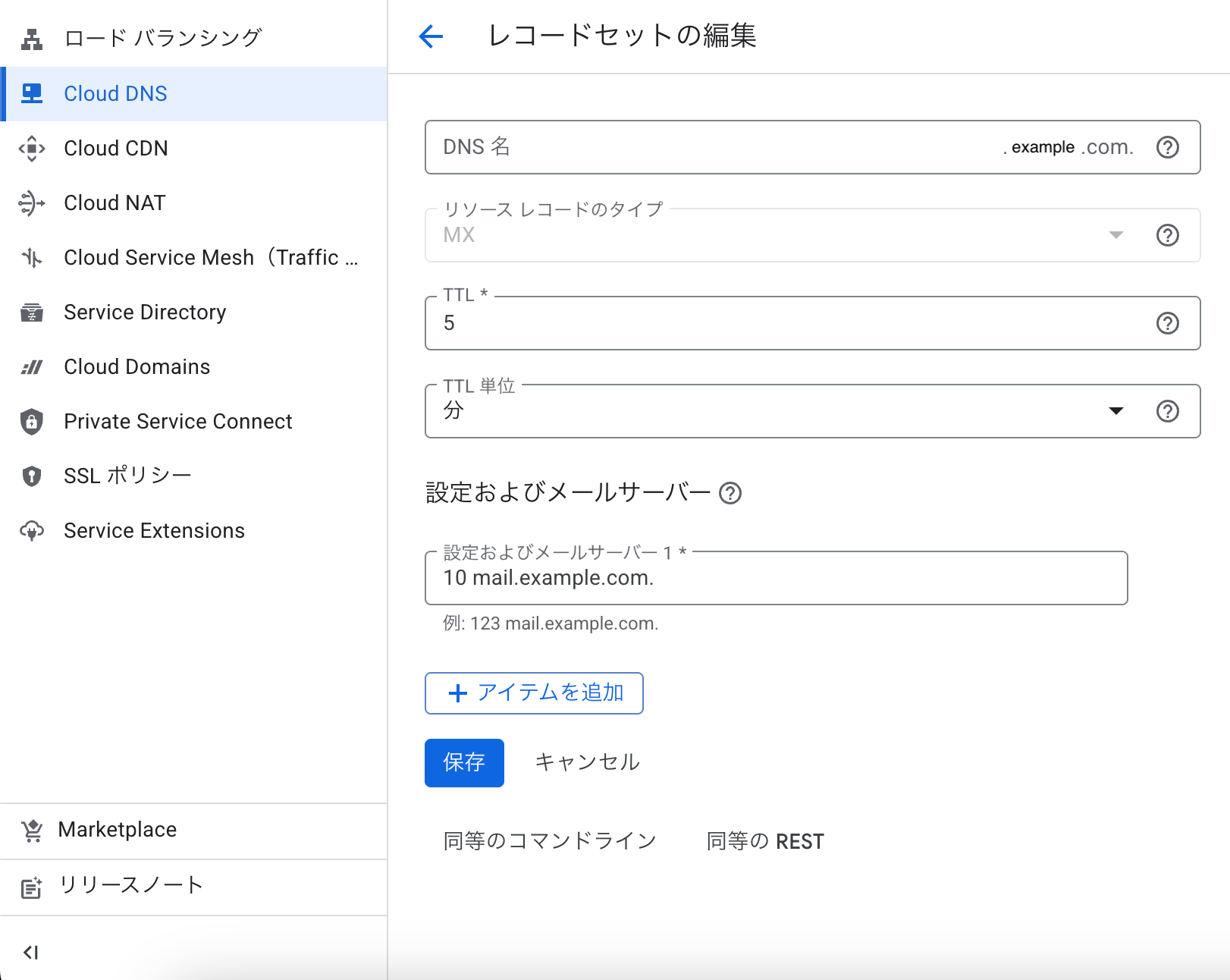 今回はCloud DNSを使用して、取得済みのドメイン(例: example.com)をメールサーバーに紐付けました。以下の手順では example.com を、ご自身が取得した独自ドメイン名に置き換えて読み進めてください。