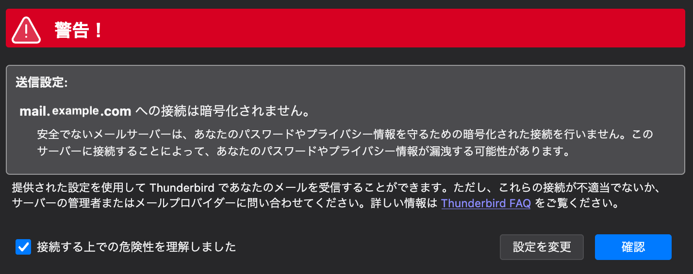 完了時、警告画面が表示されますが、本番環境ではないため確認を押して設定を完了させます。