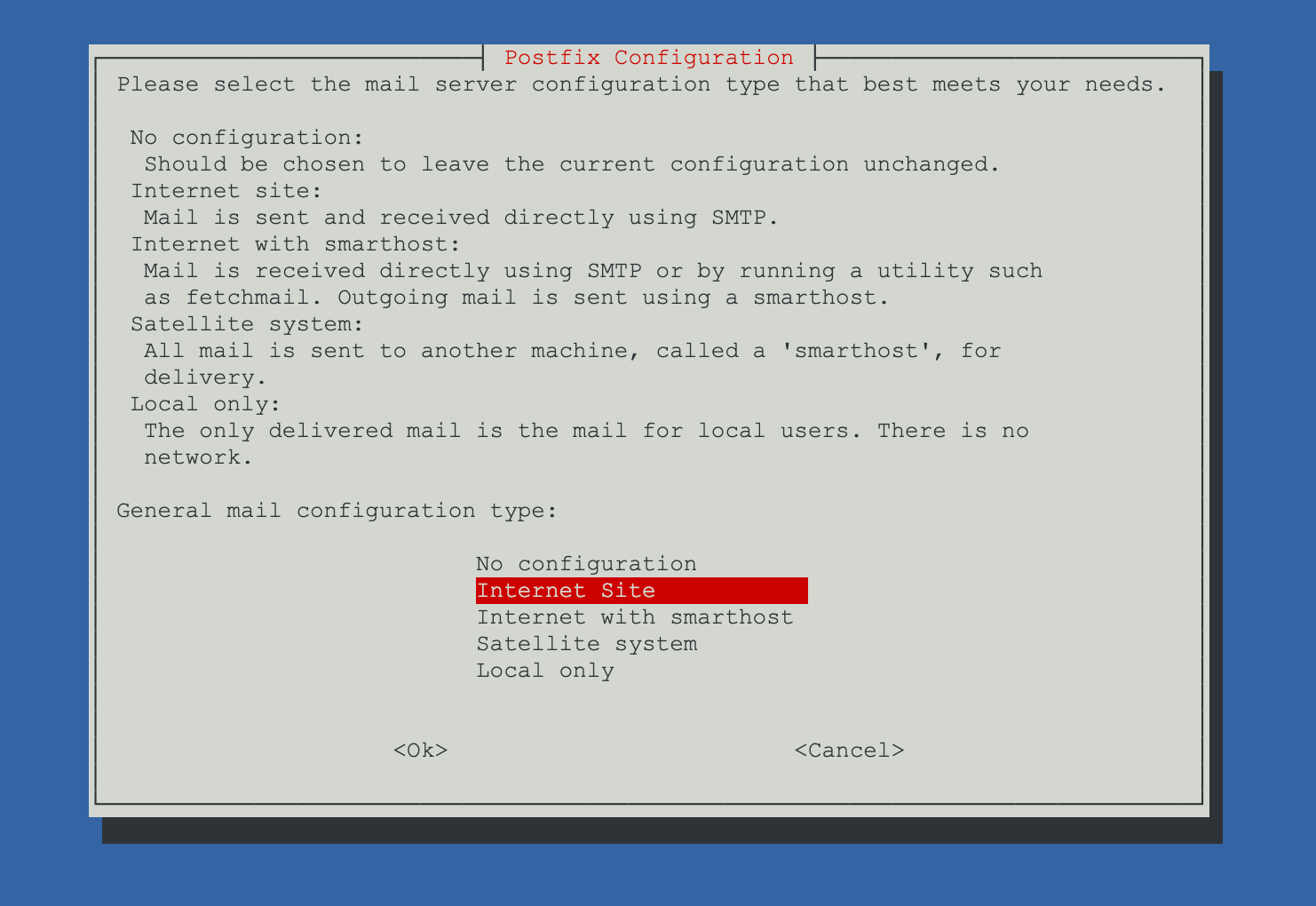 apt install postfix以下のような初期設定の画面が出てくるのでInternet Siteを選択します。その次のページではメールサーバー用のドメイン名を取得していればそのドメイン名を、取得していなければそのままOkを選択します。