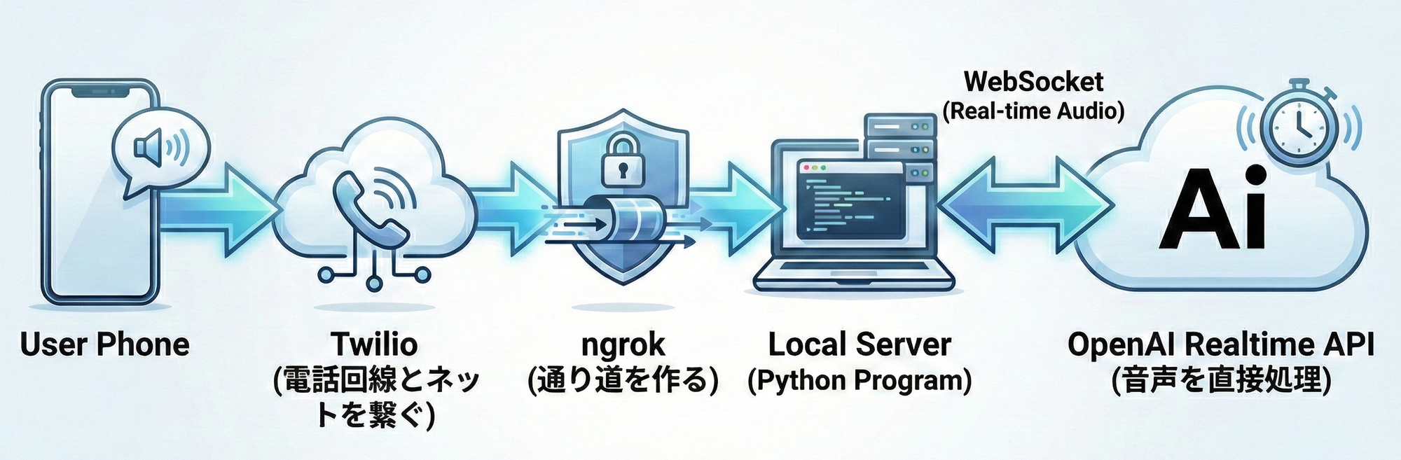 - OpenAI Realtime API:送られてきた音声を直接処理し、応答音声を生成する